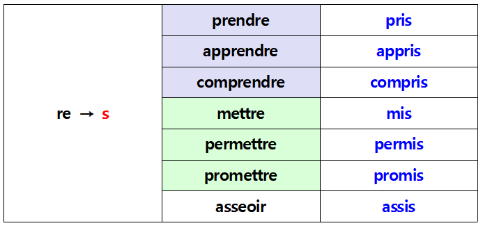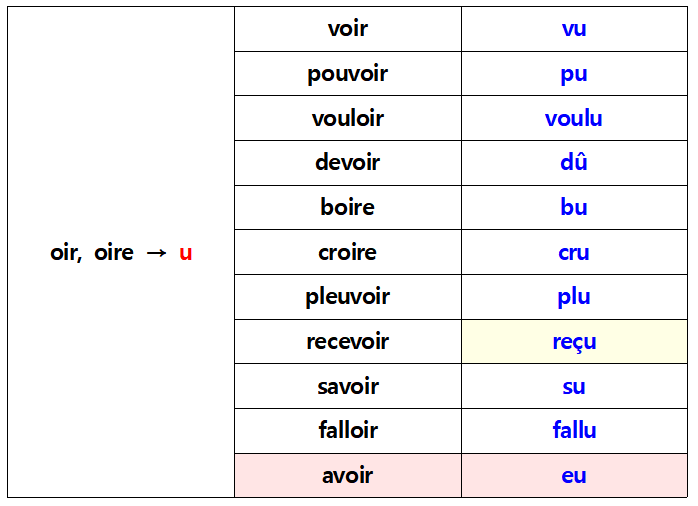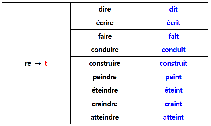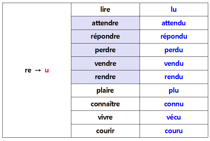 ⓵ 1군 동사 : 어간 + é (예: manger→mangé, acheter→acheté)