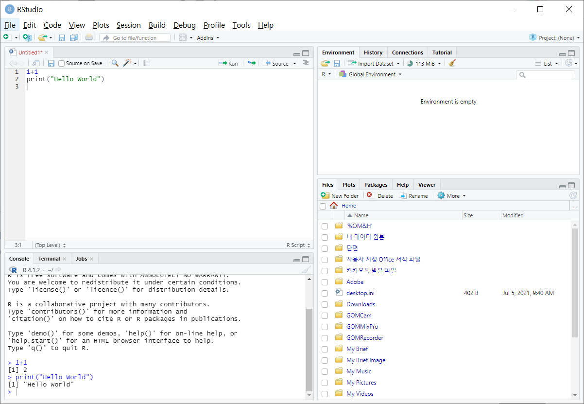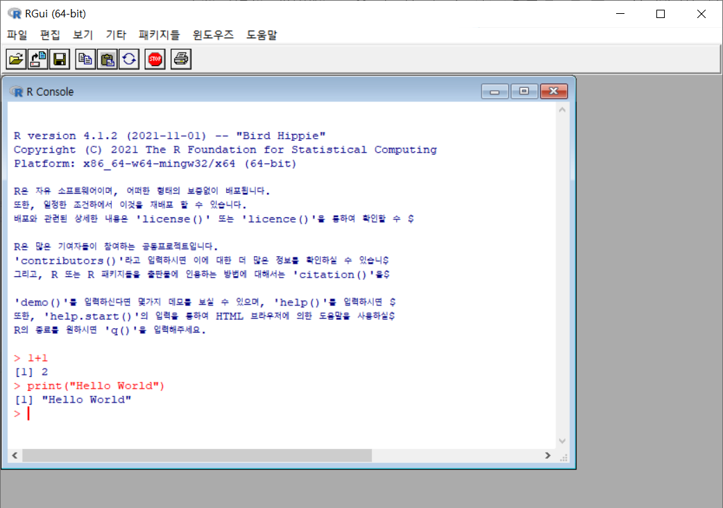 print("Hello World") 를 입력 후 Enter 쳤을 때 [1] "Hello World" 가 나오면 성공