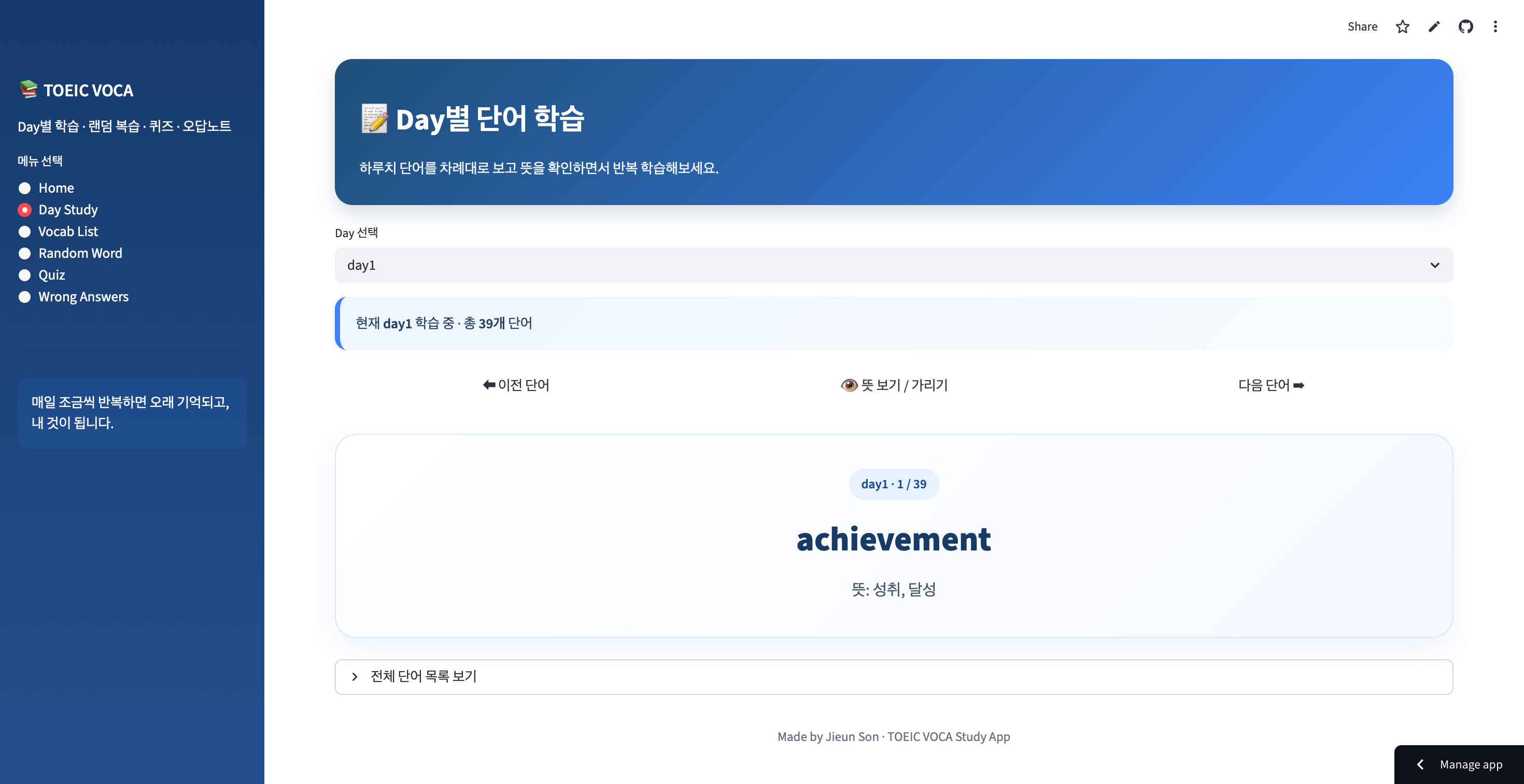 Streamlit으로 만든 TOEIC VOCA 학습 웹 앱 (Python 개인 미니 프로젝트)