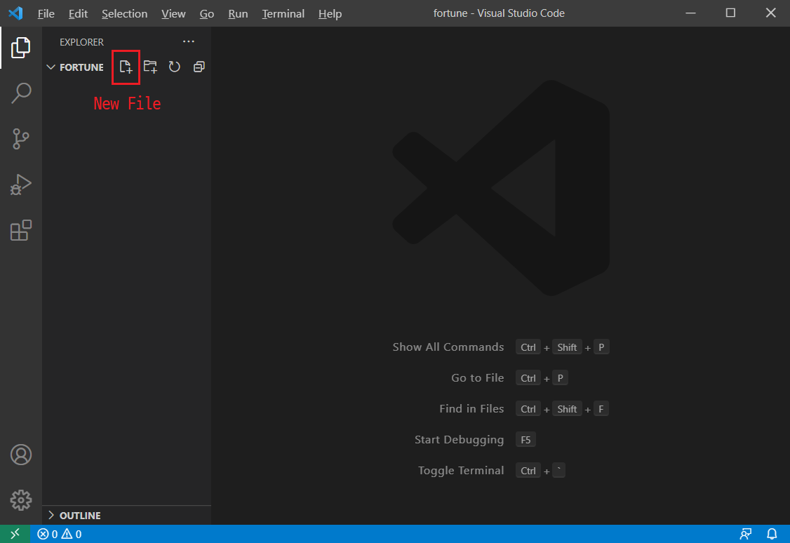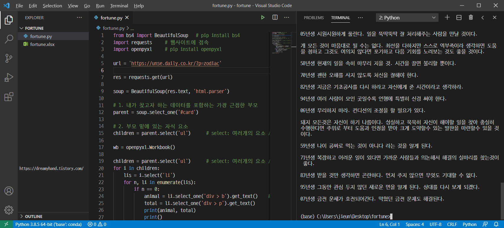 1) VSCode(Visual Studio Code)를 실행한 후, [ File > Open Folder... > 저장될 폴더 선택 ] 한다. 그리고 그 폴더에 파이썬 파일(파일명.py)을 하나 만든다. (fortune.py 라고 만들어 보겠다.)