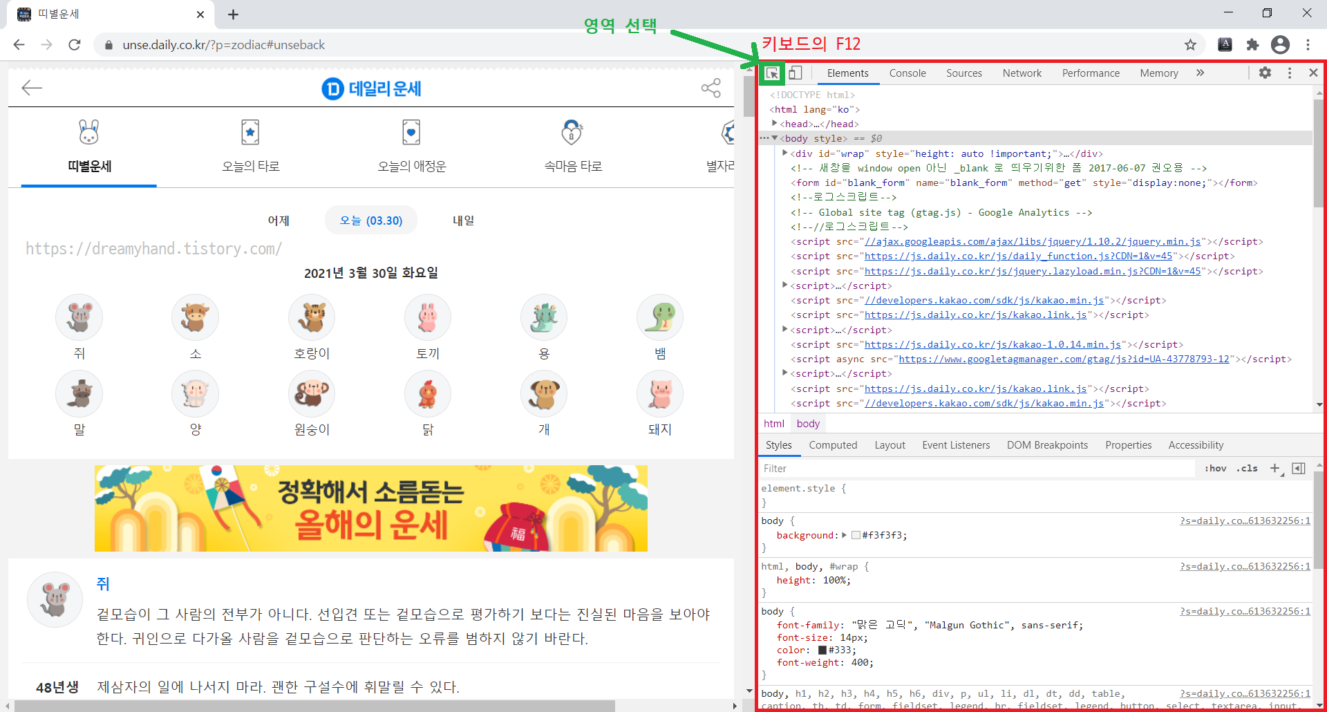 2) 크롬(Chrome)에서 데일리 운세 사이트( unse.daily.co.kr/?p=zodiac )로 접속하여 웹 페이지 HTML 구성을 살펴본다( 키보드의 F12 > Elements ).