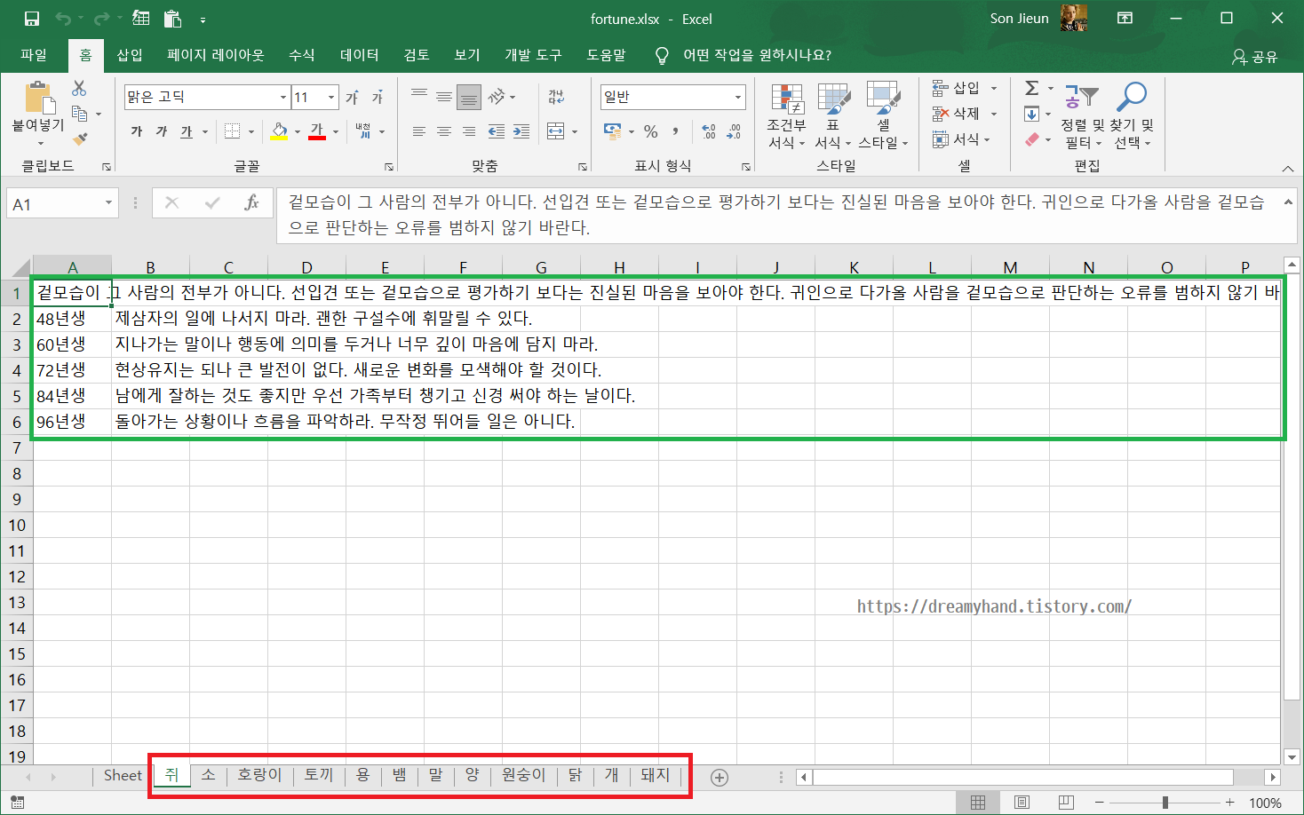 첫번째 시트는 기본값이다. 띠별로 시트가 잘 생성되었고, 시트별로 '띠별 총운 + 생년별 운세' 가 제대로 담긴 것을 볼 수 있다.